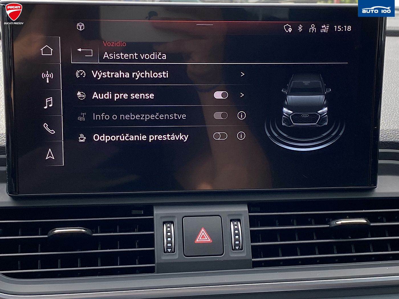 Hliníkové disky, Svetelný senzor, Ťažné zariadenie, Stop&start systém, Elektricky vyhrievané zrkadlá, Nastavenie jazdných režimov, Elektrické otváranie a zatváranie kufra, LCD prístrojový panel, Audi Connect, Audi pre sense, Automatické doplnkové kúrenie, LED svietenie, Deaktivácia airbagov, Systém kontroly tlaku v pneumatikách (TPMS), Parkovacie senzory, Elektrické ovládanie kufra, Ostrekovače svetlometov, TV,LCD panel, Asistent rozjazdu do kopca, Apple CarPlay, Android Auto, Varovanie o vzdialenosti (BAS Plus), Systém tiesňového volania (e-Call), Radenie pod volantom